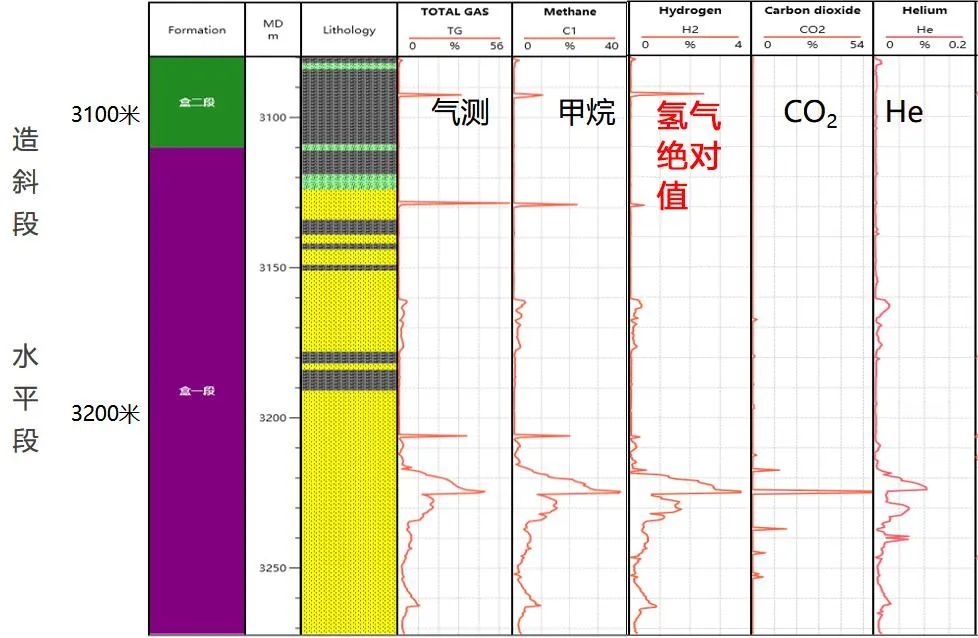 进钻深度3100m-3270m。氢气含量的总体趋势是随着气测高而增加,但也有少部分地方不同。