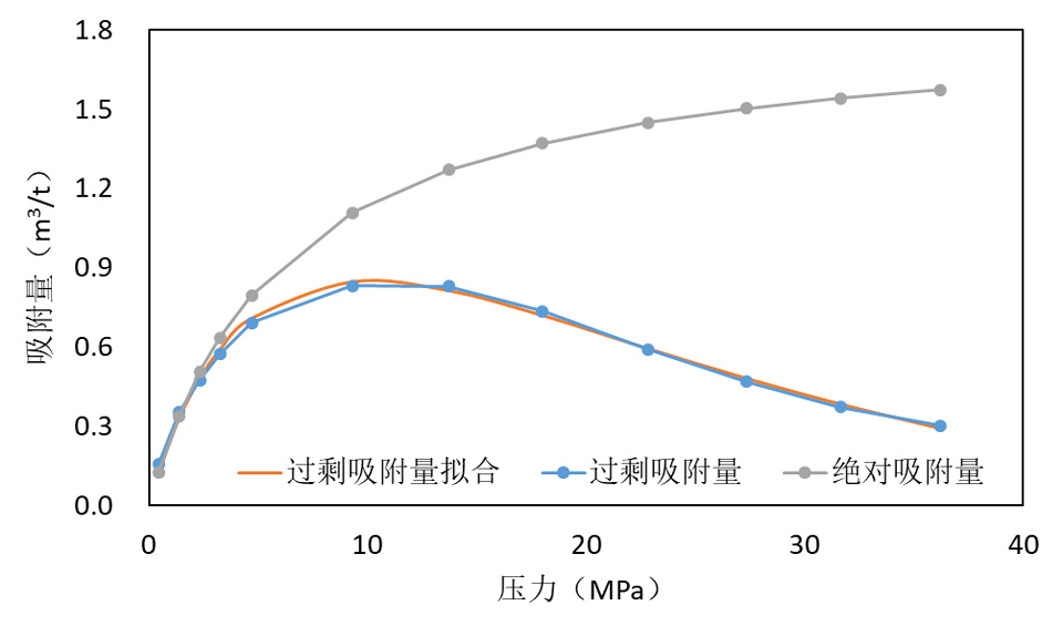 根據考慮吸附相體積的修正Langmuir模型擬合實驗數據,獲得Langmuir體積、Langmuir壓力和吸附相密度參數,計算頁巖絕對吸附量曲線。