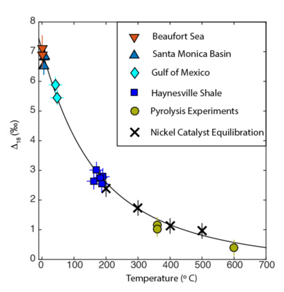 甲烷簇同位素開創了甲烷地球化學研究的新領域,深化對甲烷形成機理的識別。當甲烷形成于內部熱力平衡條件時,它能直接記錄甲烷形成的絕對溫度,為確定不同甲烷來源提供有價值的信息。在很多的地質環境中,甲烷簇同位素指示了無機成因甲烷、熱成因甲烷和生物成因甲烷的形成溫度,促進了它進一步發展成為一個地質溫度計和天然氣來源的示蹤劑。