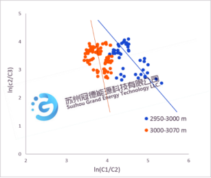 同是牛蹄塘页岩段,以深度3000m为界,其上下段泥浆气甲烷碳同位素值及其变化趋势存在明显的区别。将上、下段泥浆气样品的组分数据分别投影至ln(C1/C2)与 ln(C2/C3)交汇图版中,可以看出2950m-3000m页岩气当中干酪根裂解气所占比例要明显高于下段。