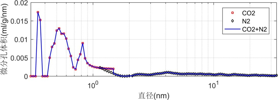 相同样品的低温CO2吸附和N2吸附联合测试,采用最优吻合算法连续表征微孔和介孔的孔径分布和比表面积特征。