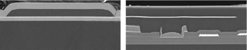 左图氩离子抛光机进行离子切割后的芯片内部结构,右图氩离子抛光机进行离子平面抛光后的芯片内部结构,SEM图像半导体芯片领域。